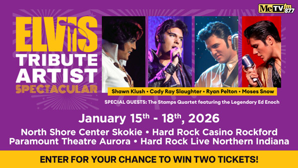PRIZES. Eleven (11) PRIZES will be awarded. Prize is two (2) tickets to see Elvis Tribute Artist Spectacular 2026 at North Shore Performing Arts Center 9501 Skokie Boulevard Skokie IL 60077 January 15, 2026, Hard Rock Casino 610 N. Bell School Rd Rockford IL 61107 January 16, 2026, Paramount Theatre 23 E. Galena Blvd Aurora IL 60506 January 17, 2026, or Hard Rock Northern Indiana 5400 W. 29th Ave. Gary, IN 46406 January 18, 2026, with an approximate retail value of $144USD. MeTVFM will randomly distribute tickets to each winner. Once tickets, date and venue are determined by MeTVFM and prize is offered to winner, no changes will be allowed. Approximate retail value of all prizes to be awarded is $1,584USD. Prizes may not be exchanged or redeemed for cash, sold, or traded.