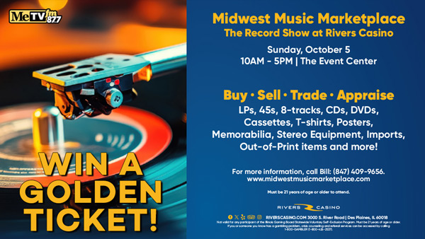 WINNER(S) LIST: If you wish to receive the names of Sweepstakes Prize Winners, you can visit the Sweepstakes Winners’ Page at metv.fm, or send a self-addressed, stamped envelope to Midwest Music Marketplace Record Show Winner’s List, 26 N. Halsted, Chicago, IL 60661. Sponsor must receive any request for the Winner’s name, no later than October 6, 2025.