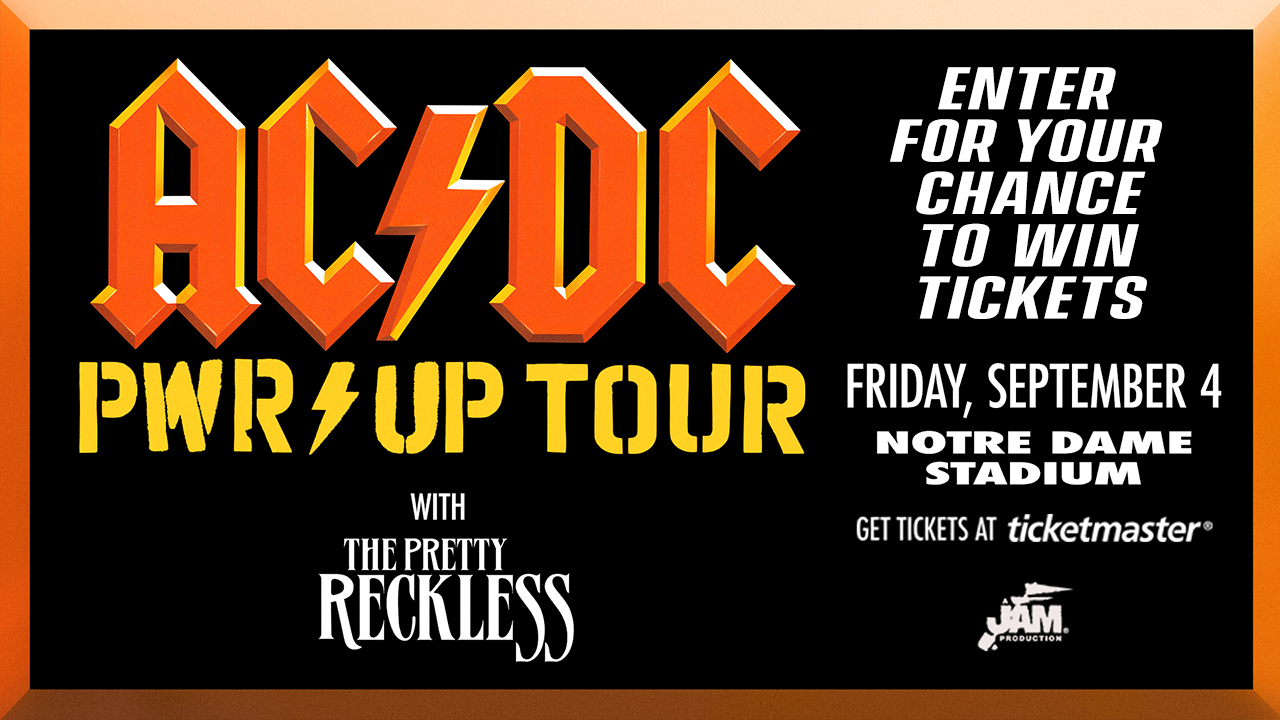 PRIZES. FOUR (4) GRAND PRIZES will be awarded. Grand Prize is TWO (2) TICKETS to AC/DC: Power Up Tour with The Pretty Reckless. Live from Notre Dame Stadium, 2010 Moose Krause Circle, South Bend, IN, on Friday, September 4th, 2026, with an approximate retail value of $300.00 USD. Approximate retail value of all prizes to be awarded is $1200.00 USD. Prizes may not be exchanged or redeemed for cash, sold, or traded.