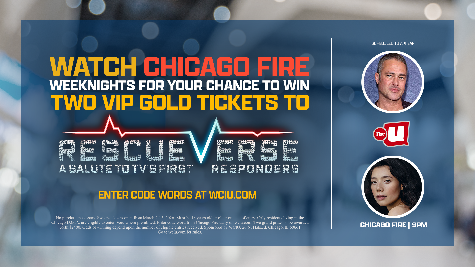HOW TO ENTER. No purchase or payment of any kind is necessary to enter or to win this Sweepstakes. The Sweepstakes begins Monday, March 2 at 9:00PM (CT) through Friday, March 13, 2026 at 11:59PM (CT) (the “Entry Period”) unless extended by Sponsor. There will be no code word nor sweepstakes entries the evening of March 9, 2026 during the Entry Period. Sponsor reserves the right to extend the Sweepstakes at any time and will provide notice by updating these Official Rules. Entrants may enter this Sweepstakes by watching Chicago Fire at 9:00 PM (CT) on The U to get a daily code word. Entrants will then go to www.wciu.com and click on the link to the “Rescueverse Sweepstakes” to fill out the entry form and code word on the website. The portal for entry of the daily code word is open until 11:59 PM (CT) each weeknight. The evening of March 9, 2026, no code word will be announced. There will be a different code word each night; entrants need only enter one code word per day for their chance to win. All entrants will be required to provide their complete name, phone number, and/or email address or other required information. Sponsor will keep all entrants’ personal information confidential unless disclosure is required by law.